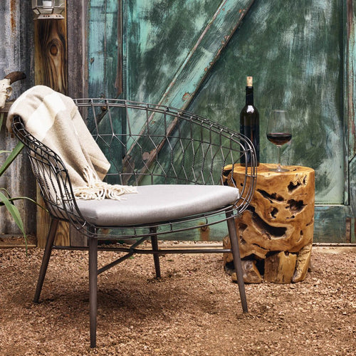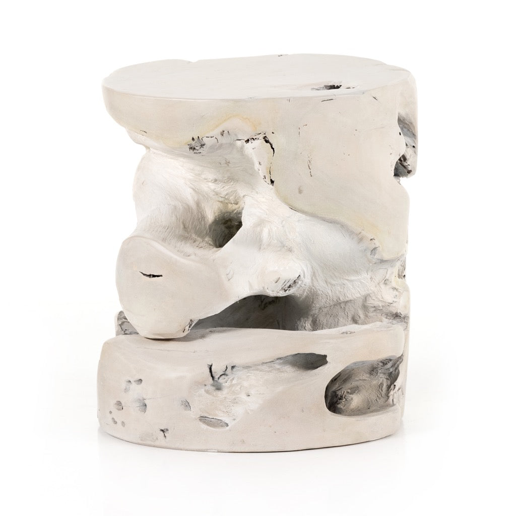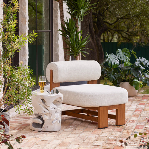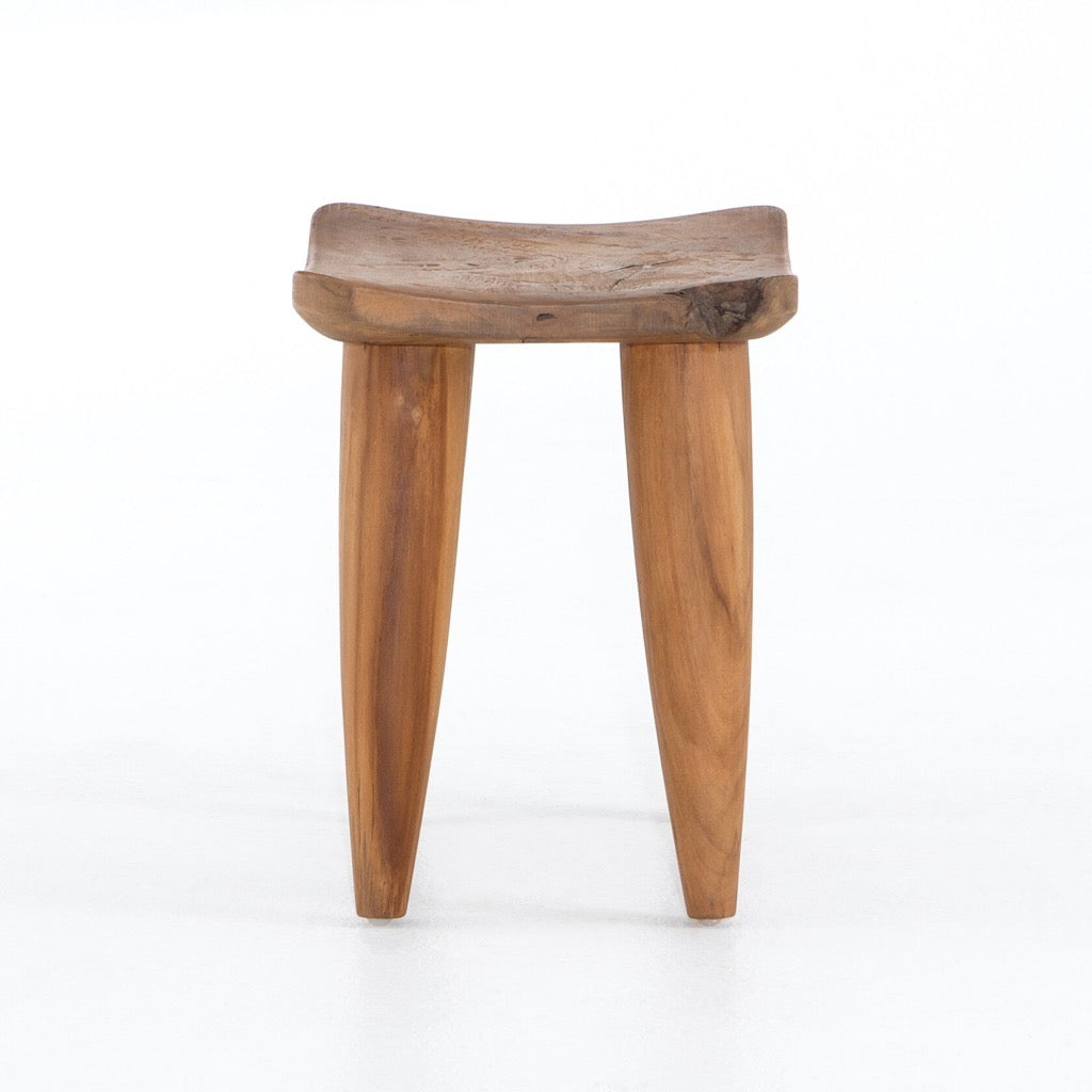 Inspired by West African design, an outdoor-friendly stool made from solid aged teak flaunts natural knots, holes and graining reflective of materials’ rich roots. Wood texture, color and graining will vary from piece to piece, and surfaces will naturally range in height up to one inch – again speaking to teak’s beautifully organic nature. Cover or store inside during inclement weather and when not in use.